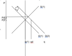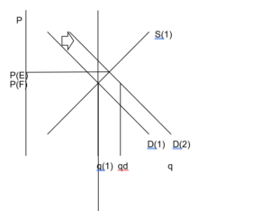 In this diagram, the problem of stagnant fares at P(F) is identified despite an outward shift in demand from D1 to D2. The price of late-night taxi fares is not increased to the price equilibrium due to the price ceiling. This creates market disequilibrium, and since qd > qs, this creates a shortage.