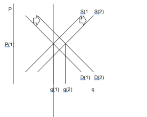 There are also two equilibrium points in this diagram; however, the price stays the same. This is possible because supply shifts to the same amount as the demand curve.